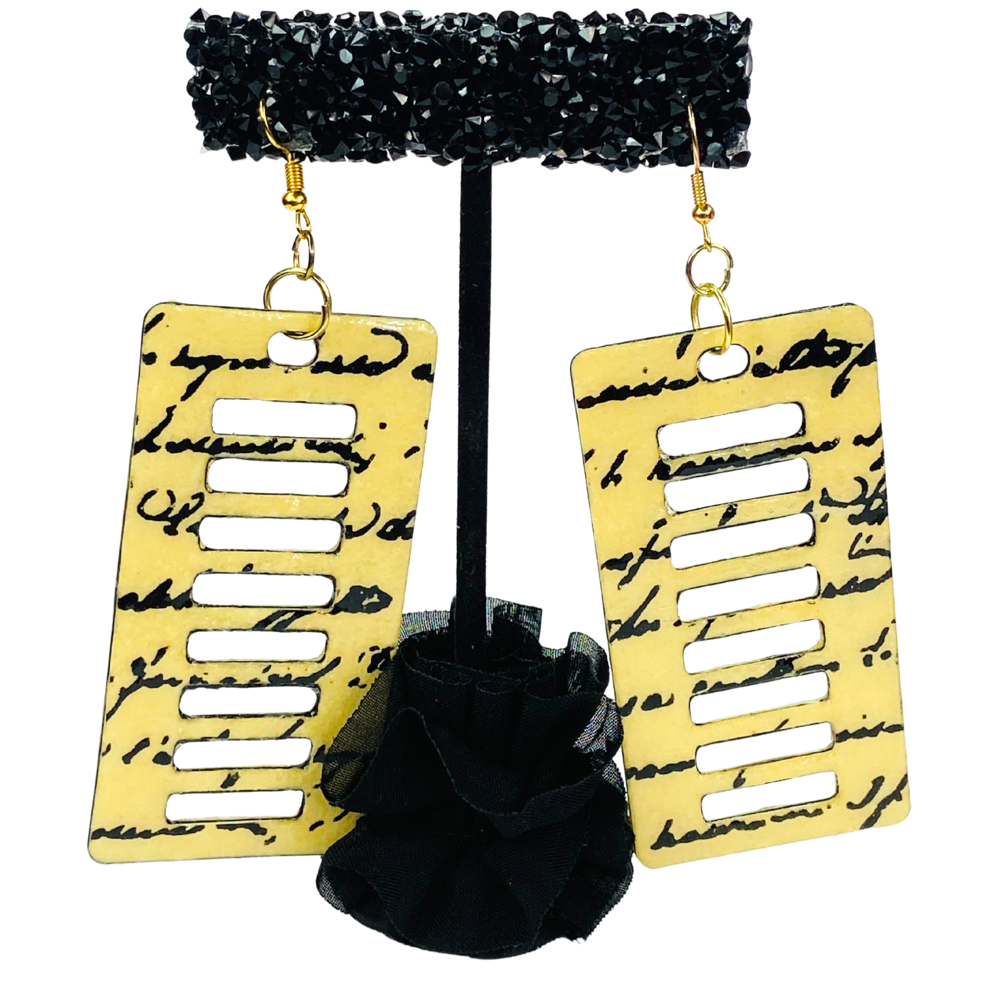 Gold-toned earrings with vintage script detailing, giving a timeless and classy aesthetic.